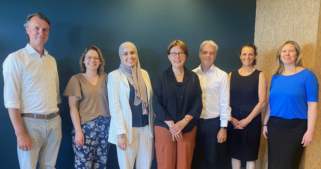 v.l.n.r.: David Verschoor, directeur Hersenstichting; Kirstin Heutinck, directeur Stichting MS Research; Laila El Aziz, programma manager Health~Holland; Elga de Vries, hoogleraar Neuro-immunologie, Amsterdam UMC; Marco Blom, wetenschappelijk directeur Alzheimer Nederland; Laura M’Rabet MT-lid Kennis en Innovatie Epilepsie NL; Laura Valstar, Kennis en Innovatie, Hersenstichting / programma coördinator BRAINS.